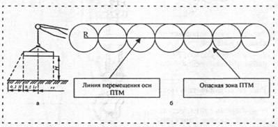 а — определение радиуса окружности, в пределах которой может упасть груз; б — определение опасной зоны при перемещении ПТМ